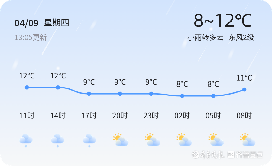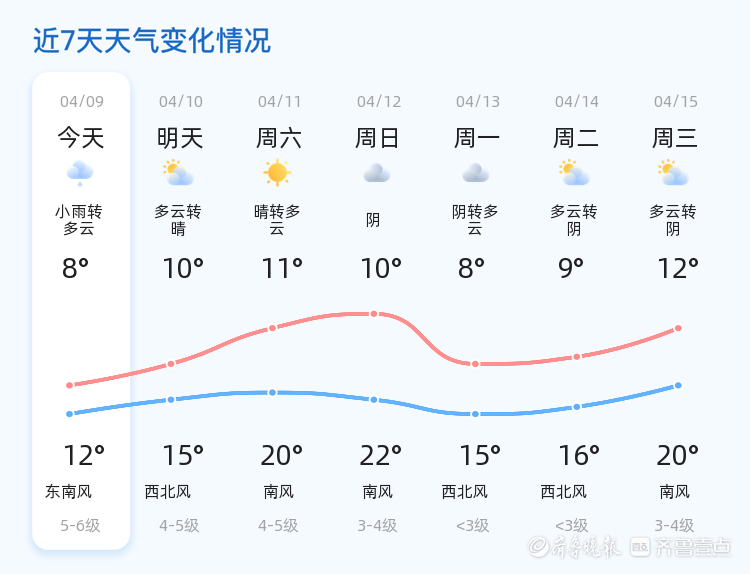 今天是4月9日,星期四,农历二月廿二。威海市今日天气为小雨转多云,气温在8℃至12℃之间,东风2级,空气湿度为100%,PM2.5指数为34,空气质量良好。各区天气情况总体稳定,小雨转多云的天气给市民出行带来些许不便,但气温适宜,适合户外活动。明天天气预计为多云转晴,气温将略有上升,范围在10℃至15℃之间,西北风4-5级。与今天相比,降雨天气结束,阳光开始增多,空气质量继续维持良好状态。未来三天,威海市天气趋势总体平稳,气温逐步回升。预计最高气温将达到20℃,最低气温为8℃。周五和周六以晴或多云天气为主,周日可能出现阴天。市民应根据天气变化适时增减衣物,尤其是周五和周六风力较大,出行时请注意安全,防范大风带来的影响。温馨提示