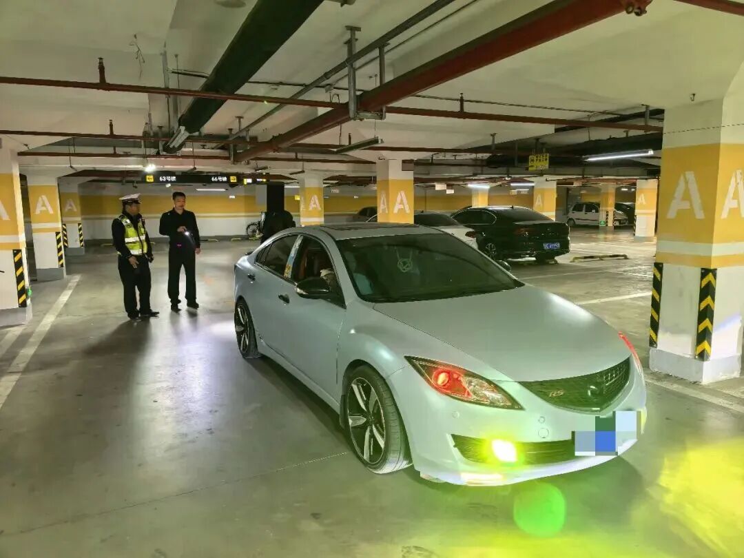 在现场处置的过程中,民警在同一地下停车场内,发现了另外一辆涉嫌“炸街”的车辆,车辆外型、排气管均被擅自改变。