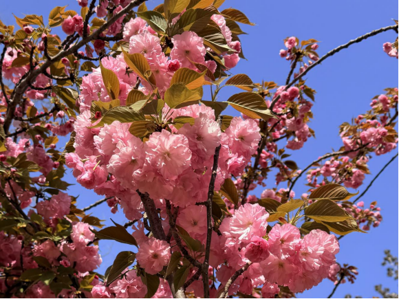不同于早樱的轻盈素雅,晚樱花朵更为饱满繁密,粉白相间的花瓣层层叠叠,簇拥在枝头,微风拂过,花枝轻颤,宛若云霞飘落,一步一景皆是温柔诗意。