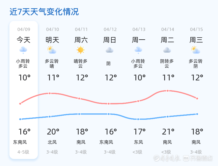 今天是4月9日,星期四,农历二月廿二。青岛市迎来了一天的小雨转多云天气,气温在10℃至16℃之间波动,西北风2级,空气湿度较高,达到90%,PM2.5指数为30,空气质量良好。各区天气情况基本一致,市民出行需注意携带雨具,谨防路面湿滑。