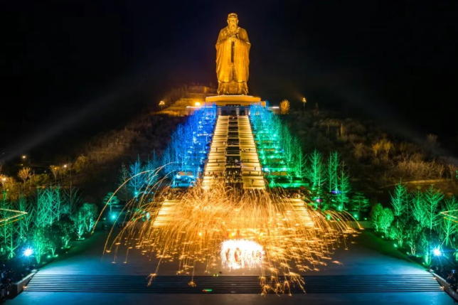 夜幕降临,奔赴尼山圣境,在无人机光影秀的璀璨夜空下,感受传统与现代的极致交融。
