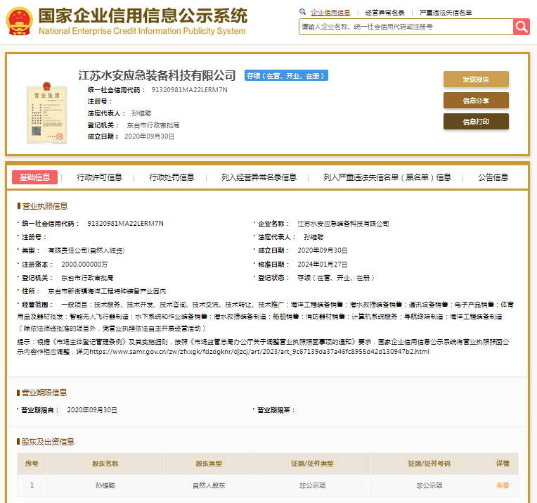 国家企业信用信息公示系统显示,江苏水安应急装备科技有限公司成立于2020年,注册资本2000万元人民币,法定代表人孙维聪。