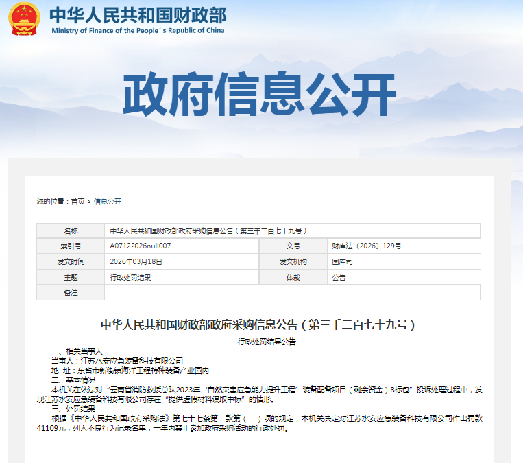 齐鲁晚报·齐鲁壹点记者于中华人民共和国财政部政府信息公开栏获悉,3月18日,江苏水安应急装备科技有限公司(下称“江苏水安应急装备”)被行政处罚。文号:财库法〔2026〕129号。