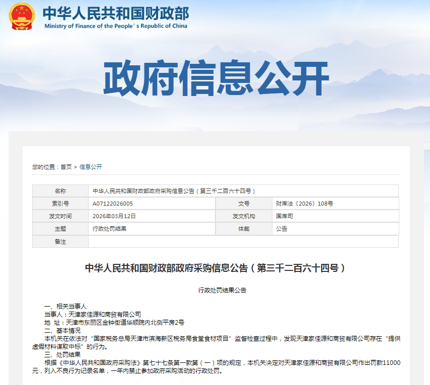 齐鲁晚报·齐鲁壹点记者于中华人民共和国财政部政府信息公开栏获悉,3月12日,天津家佳源和商贸有限公司(下称“天津家佳源和商贸”)被行政处罚。文号:财库法〔2026〕108号。