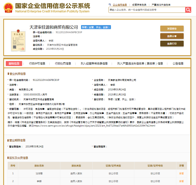 国家企业信用信息公示系统显示,天津家佳源和商贸有限公司成立于2019年,注册资本3000万元人民币,法定代表人李娜。