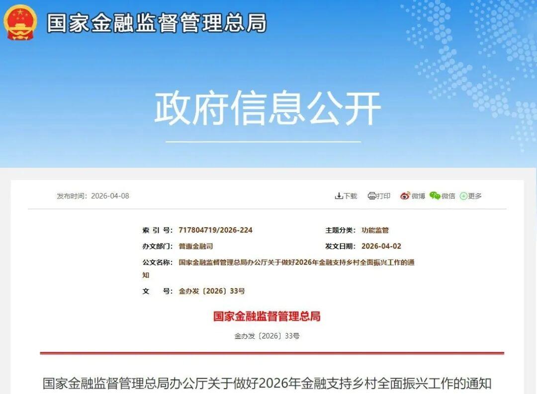 国家金融监督管理总局4月8日对外发布通知明确,2026年农业发展银行、大中型商业银行要继续单列涉农信贷计划,努力实现同口径涉农贷款余额较年初持续增长目标。