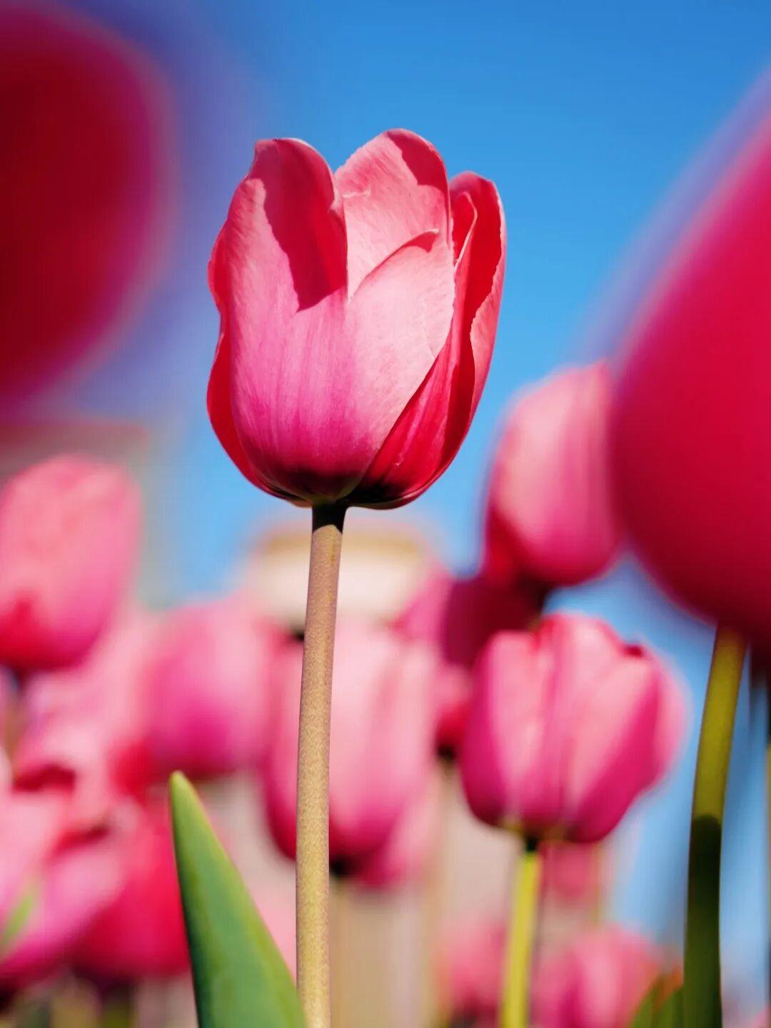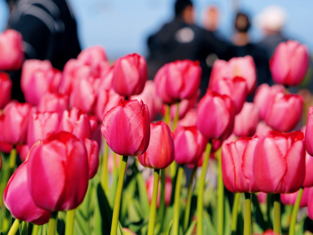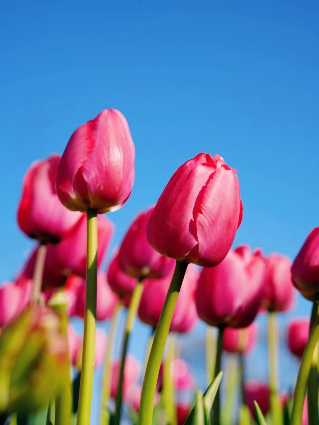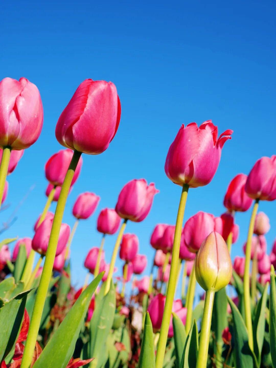 ①低角度拍摄:蹲在花田边缘,镜头向上,以大海和天空为背景,拍郁金香全景,避开人群;