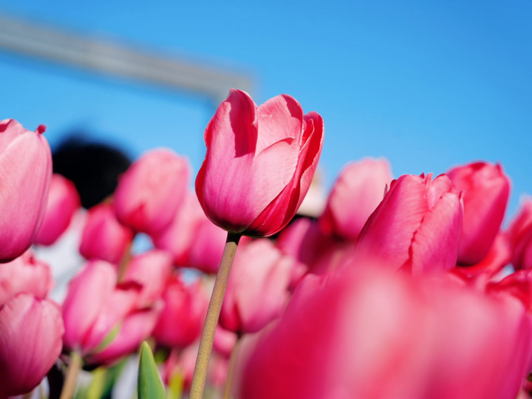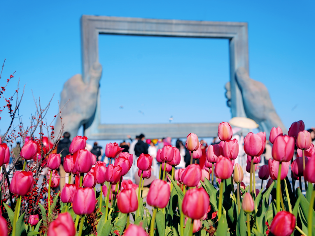 大相框周边:这里的郁金香主要以粉色为主,种植在大相框前的花坛里,数量虽不如海魂广场多,但胜在地标加持——站在大相框前拍照,以粉色郁金香为前景,天然“画框+花海”,特别适合拍人像、打卡纪念。