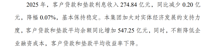 报告显示,2025 年,渝农商行实现利息收入464.65亿元,同比减少6.23亿元,降幅1.32%。渝农商行表示,主要受市场利率下调影响。2025年,客户贷款和垫款利息收入274.84亿元,同比减少0.20亿元,降幅0.07%。2025年,金融投资利息收入149.70亿元,同比减少8.15亿元,降幅5.16%。渝农商行在报告中表示,主要是资金市场利率下行,本集团金融投资收益率下降。