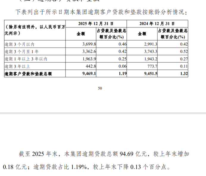 虽然总体的不良率是下降的,但其零售贷款不良率却在上升。据报告,截至2025年末,渝农商行零售贷款(含垫款)为3010.22亿元,其零售贷款不良率为2.07%,较上年末上行47个基点;零售贷款不良余额较上年末增加15.3亿元至62.17亿元。此外,该行新增逾期上行幅度最大,其逾期3个月以内贷款较上年末增长23.69%。