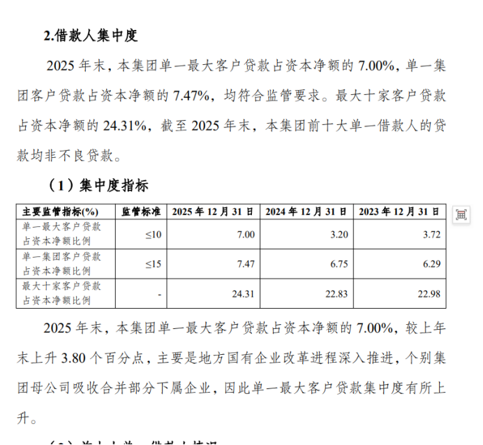 此外,记者注意到,渝农商行的单一客户集中度也在上升,2025年末,该行单一最大客户贷款占资本净额的7.00%,较上年末上升3.80个百分点,该指标监管标准为要小于等于10%,目前已经比较接近红线。该行称上升主要是地方国有企业改革进程深入推进,个别集团母公司吸收合并部分下属企业,因此单一最大客户贷款集中度有所上升。
