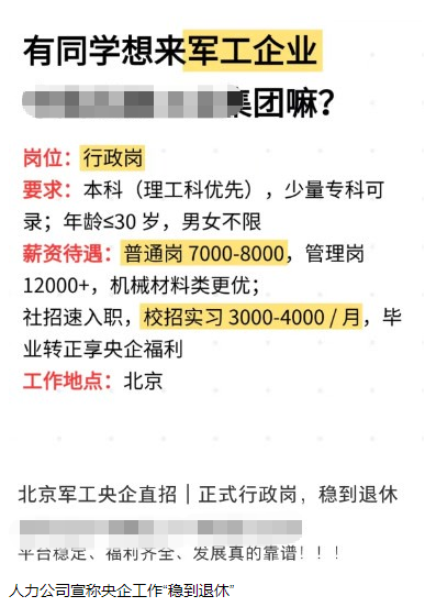 “民航局招人,企业编制太香了!”“兵器工业集团,内推优先安排”“国家能源集团,央企直签招人”……一家人力资源公司账号的主页上,不乏央企国企工作岗位信息。这些信息,不仅标注出具体岗位、薪资待遇、相关要求,更用诸如“先到先得”“入职即签订正式劳动合同”“1周面试,3到5天上岗”等字眼诱惑用户。