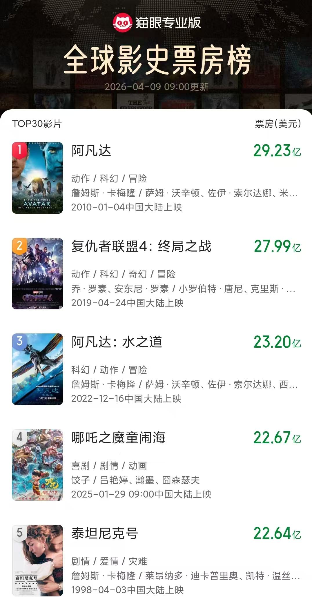 4月9日,专业平台全球票房排行榜显示,《哪吒之魔童闹海》(简称《哪吒2》)全球累计票房已达22.67亿美元,正式超越《泰坦尼克号》的22.64亿美元,跻身全球影史票房第四位,与排名第三的《阿凡达:水之道》(《阿凡达 2》)的23.20亿美元仅差0.53亿美元,距离影史前三宝座近在咫尺。
