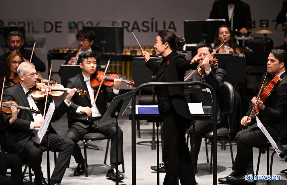 징환(景煥·가운데) 중국교향악단 상임지휘자가 7일 브라질 수도 브라질리아에서 열린 '중국·브라질 문화의 해' 특별 음악회에서 지휘하고 있다.2026.4.8