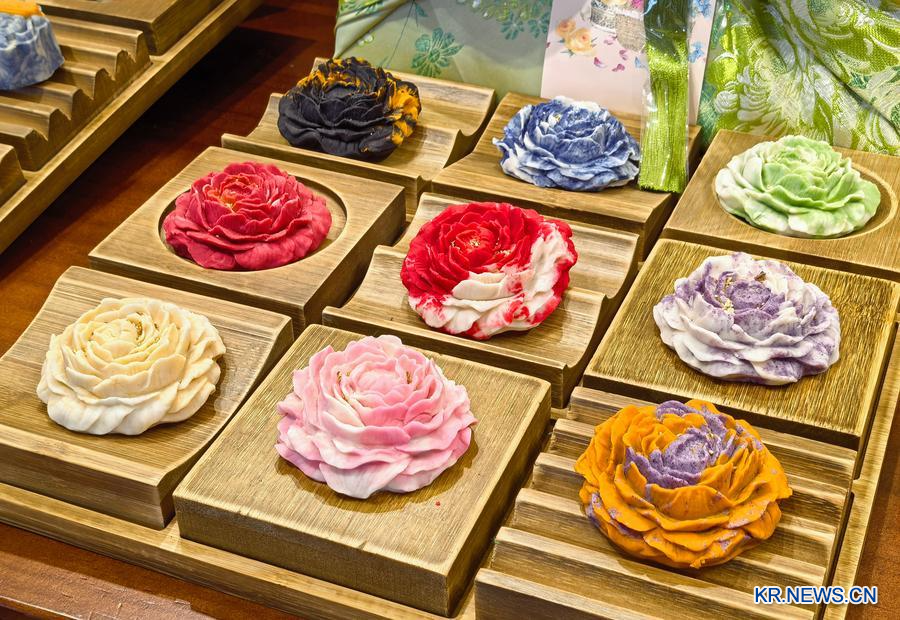 허난(河南)성 뤄양시 난베이리지(南北李記) 문화창의 디저트 매장의 모란 화과자. (사진/신화통신)