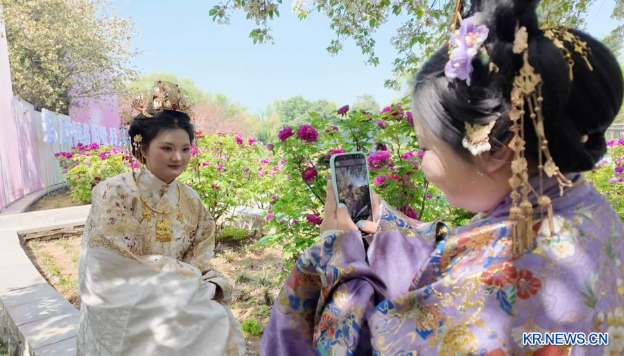 관광객들이 모란을 배경으로 기념촬영을 하고 있다. (사진/신화통신)