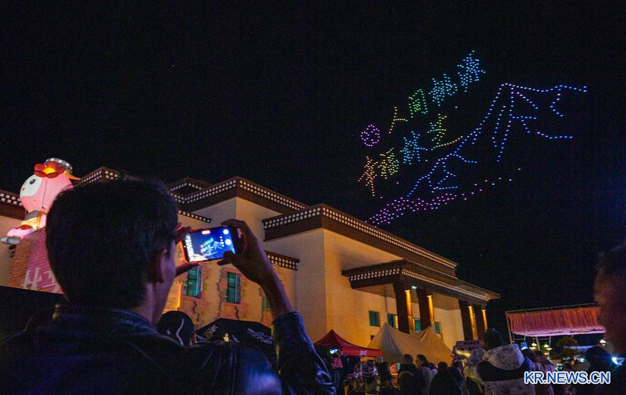3일 '린즈 복숭아꽃 페스티벌' 개막식에서 펼쳐진 드론 공연. (사진/신화통신)
