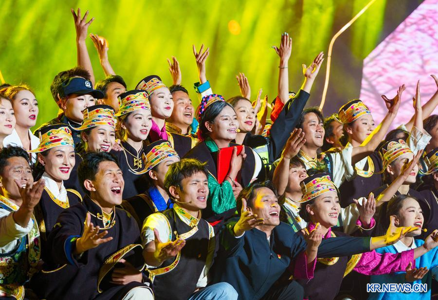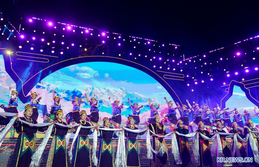지난 3일 '제23회 린즈(林芝) 복숭아꽃 관광·문화 페스티벌'(이하 린즈 복숭아꽃 페스티벌) 개막식에서 펼쳐진 문화예술 공연 현장. (사진/신화통신)