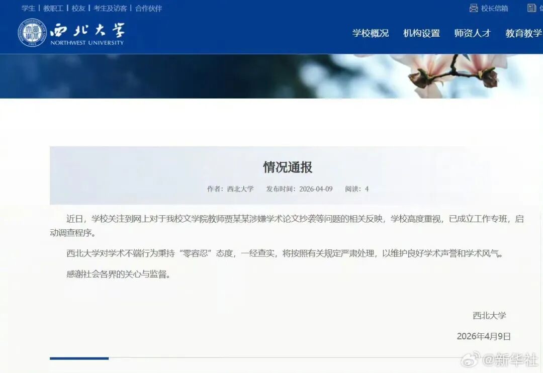 西北大学通报:近日,学校关注到网上对于我校文学院教师贾某某涉嫌学术论文抄袭等问题的相关反映,学校高度重视,已成立工作专班,启动调查程序。西北大学对学术不端行为秉持“零容忍”态度,一经查实,将按照有关规定严肃处理,以维护良好学术声誉和学术风气。感谢社会各界的关心与监督。