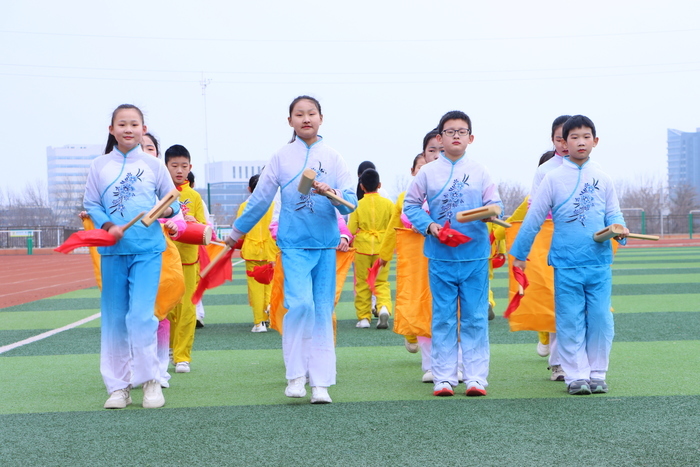 “咚咚锵!咚咚锵!”济南高新区泰和小学的操场上,铿锵鼓点震彻校园,二至五年级的同学们身着鲜艳传统服饰,手持梆子、小鼓与彩绸包袱,踏着明快节奏翩翩起舞。红绸翻飞间,稚气未脱的脸庞写满专注;鼓点起落中,灵动舞步踏出非遗传承的蓬勃活力。这场常态化的梆鼓秧歌展演,既是学校“科学教育、中医药文化、梆鼓秧歌”三大特色的生动呈现,更是教育部“健康第一”教育理念在校园落地生根的鲜活实践。