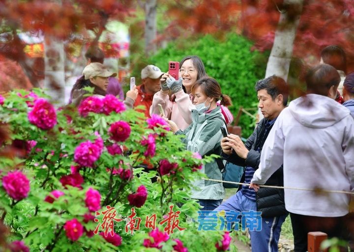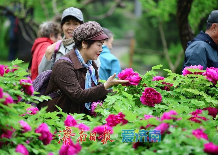 泉城公园牡丹园是济南市区内面积最大的牡丹集中种植区,占地4.5公顷,共有4000余株、150多个品种的牡丹与芍药,目前凤丹牡丹、赵粉牡丹、岛锦牡丹等早花、中花品种已经盛开。走进牡丹园放眼望去,粉色、红色、白色的牡丹花和枝叶上挂着点点雨珠,娇艳欲滴中更显雍容华贵之态,市民游客纷纷拿出相机、手机记录下美不胜收的春日之美,赞叹声和快门声交织在一起。