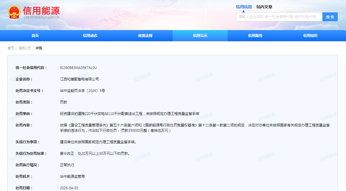 华中监能罚决字〔2026〕5号内容显示,江西和惠配售电公司的被处罚事由是:投资建设的建陶220千伏变电站110千伏配套送出工程,未按照规定办理工程质量监督手续。