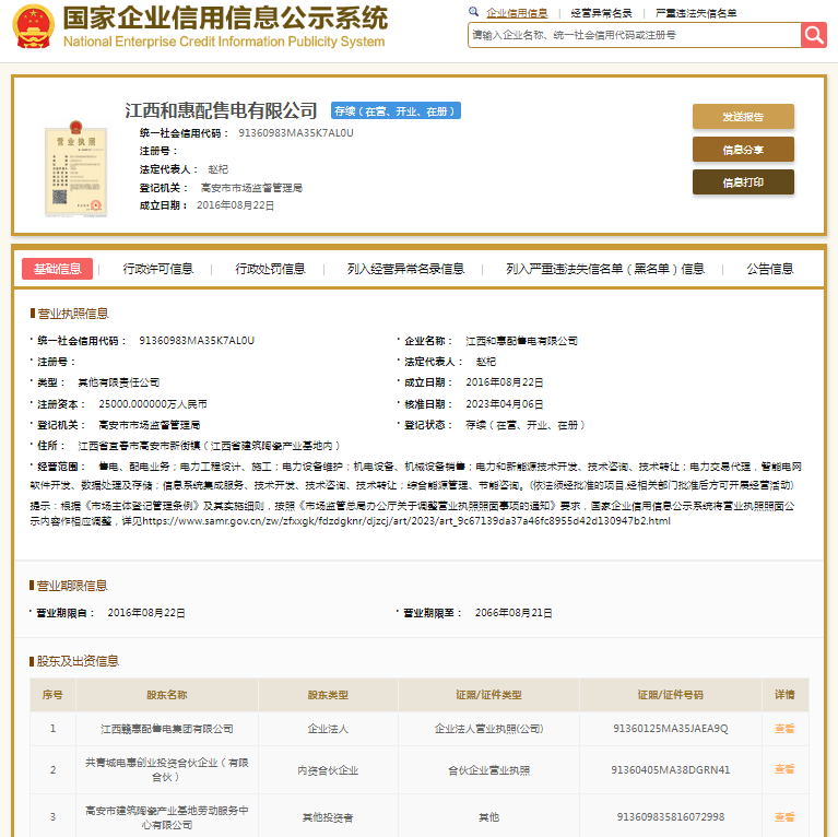 国家企业信用信息公示系统显示,江西和惠配售电有限公司成立于2016年,法定代表人赵杞,注册资本25000万元人民币。股东方面,江西赣惠配售电集团有限公司、共青城电惠创业投资合伙企业(有限合伙)持股比例均为40%;高安市建筑陶瓷产业基地劳动服务中心有限公司持股20%。