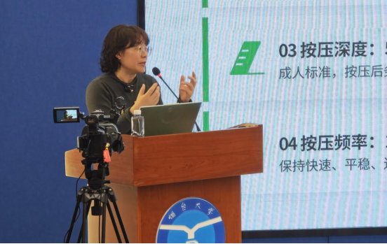 讲座现场,三大核心环节层层递进,让师生既能学会专业知识,又能掌握实操技能。在15分钟专题精华讲座环节,初红霞结合典型临床病例,围绕心源性猝死展开科普,详细讲解高危人群、诱发因素、猝死前预警信号及黄金4分钟急救流程,深入解读我国心源性猝死的严峻现状,强调规范施救的重要性,并从科学预防、社会协同防控等方面给出专业建议,引导师生重视心血管健康,主动规避健康风险。