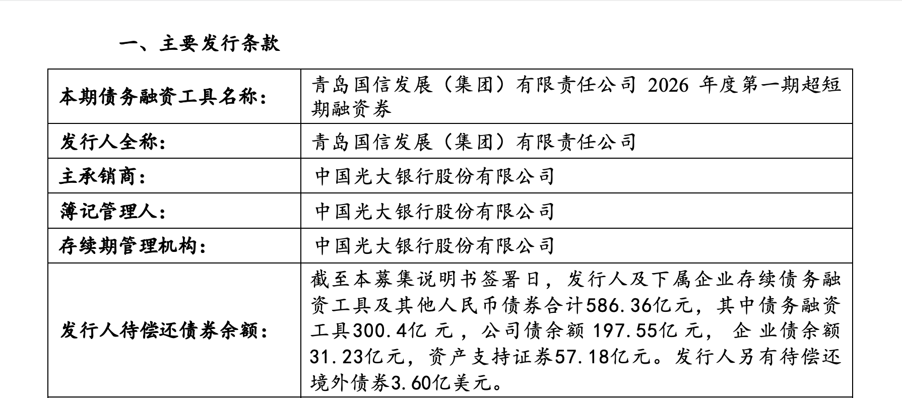 4月9日,青岛国信发展(集团)有限责任公司(下称“青岛国信集团”)发布2026年度第一期超短期融资券相关公告。公告显示,本期超短融发行金额5亿元,发行期限164天,中国光大银行股份有限公司为簿记管理人,本期债务融资工具采用固定利率方式,按面值(人民币100元)发行,票面利率根据集中簿记建档、集中配售的结果确定。计划发行日期为4月10日,缴款日期为4月13日。