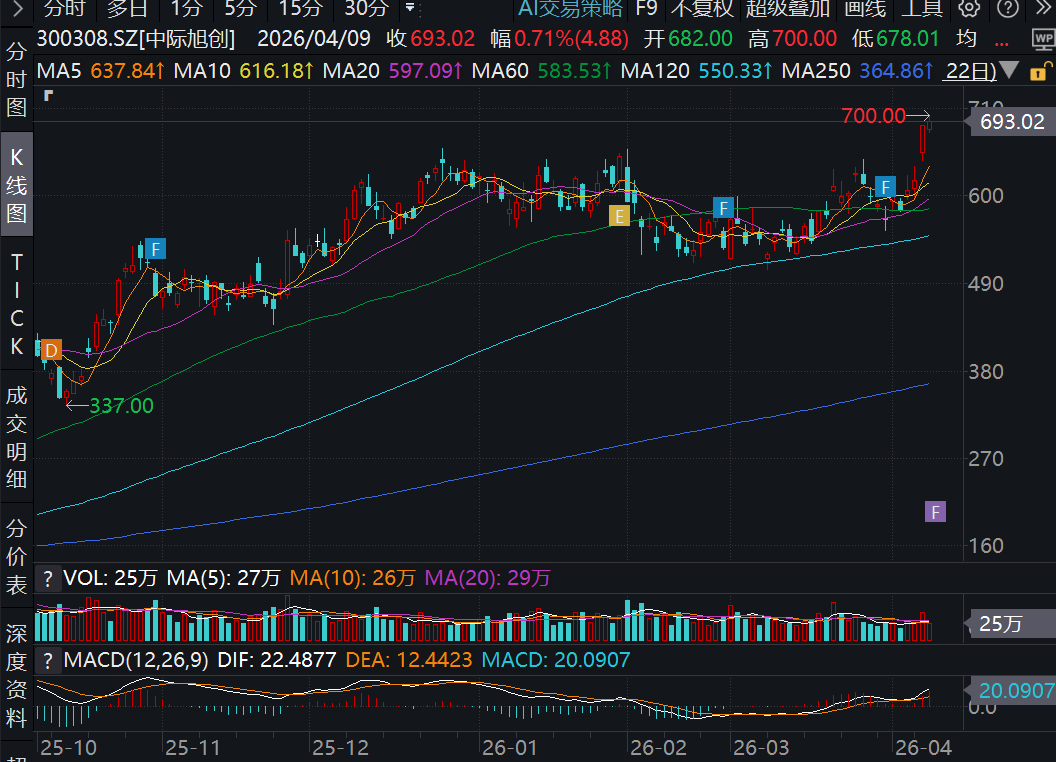 在经过4月3日、7日、8日的“3连阳”后,4月9日,“山东A股市值一哥”中际旭创(300308.SZ)继续上涨,盘中最高触及700元,创历史新高。