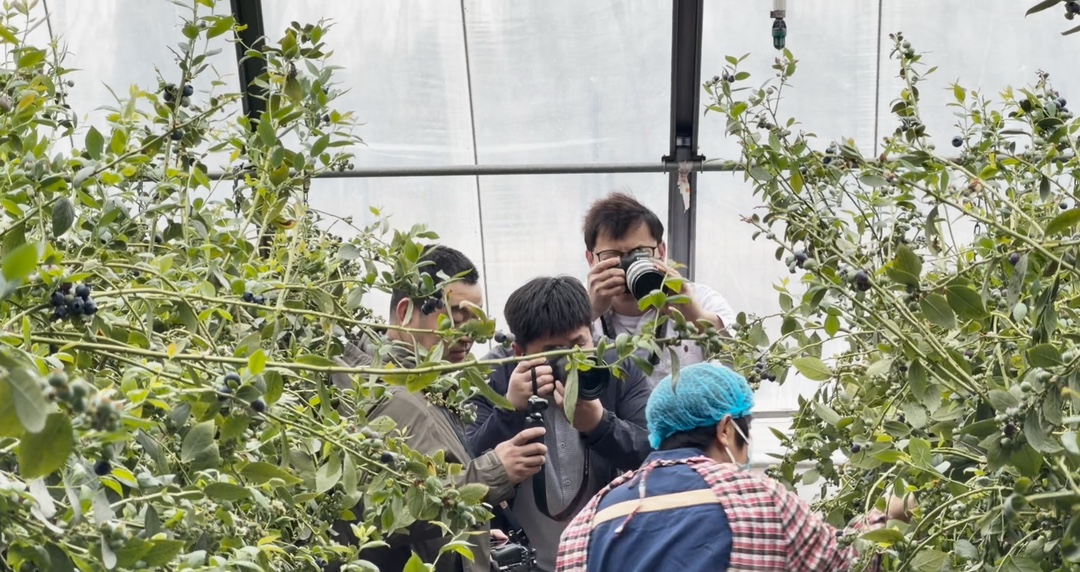 327亩土地上,80个蓝莓温室大棚错落排布,绿意盎然间硕果累累,“科技+产业+富民”的乡村振兴新模式,让媒体嘉宾印象深刻。