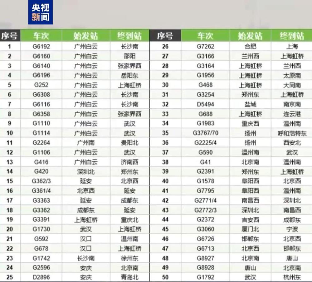 新增车次包括北京南至温州南的G41次,广州白云至济南西的G416次等。