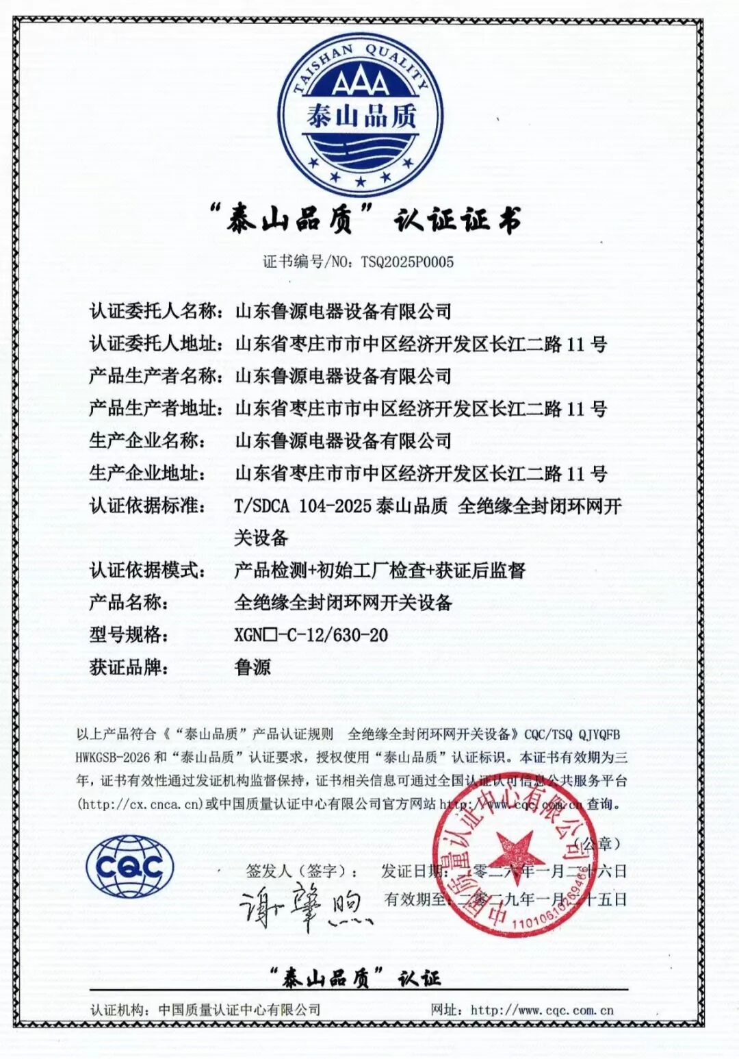 喜报!枣庄市本土企业鲁源电器荣获2025年度“泰山品质”认证