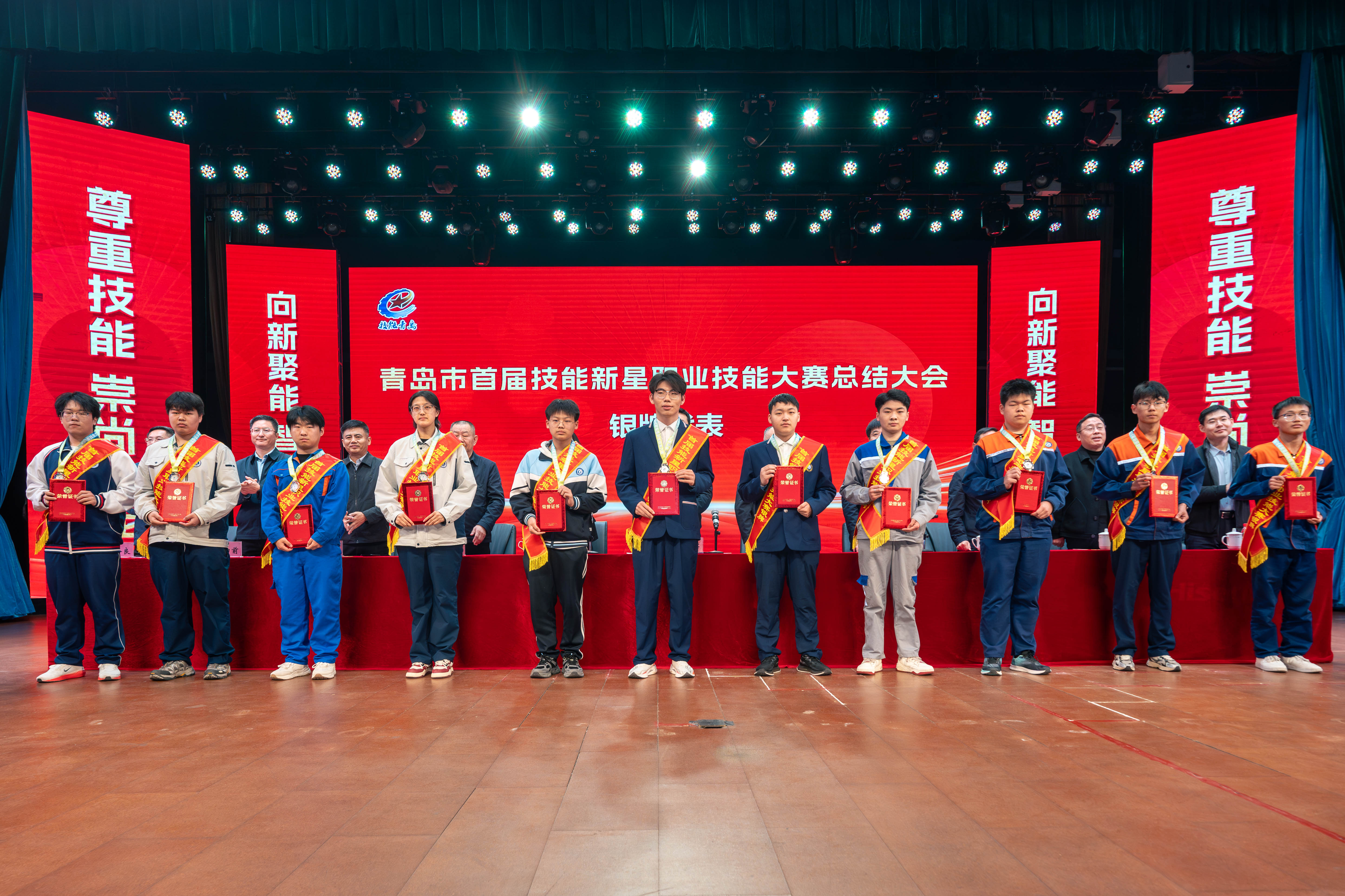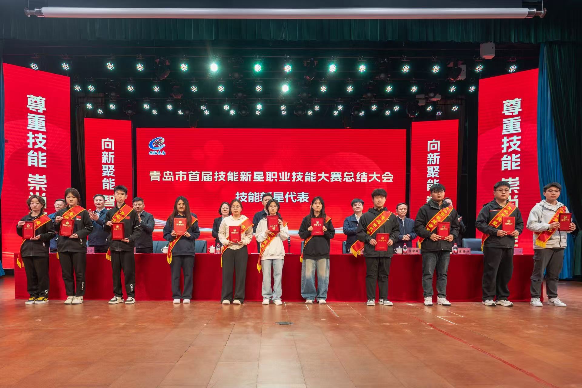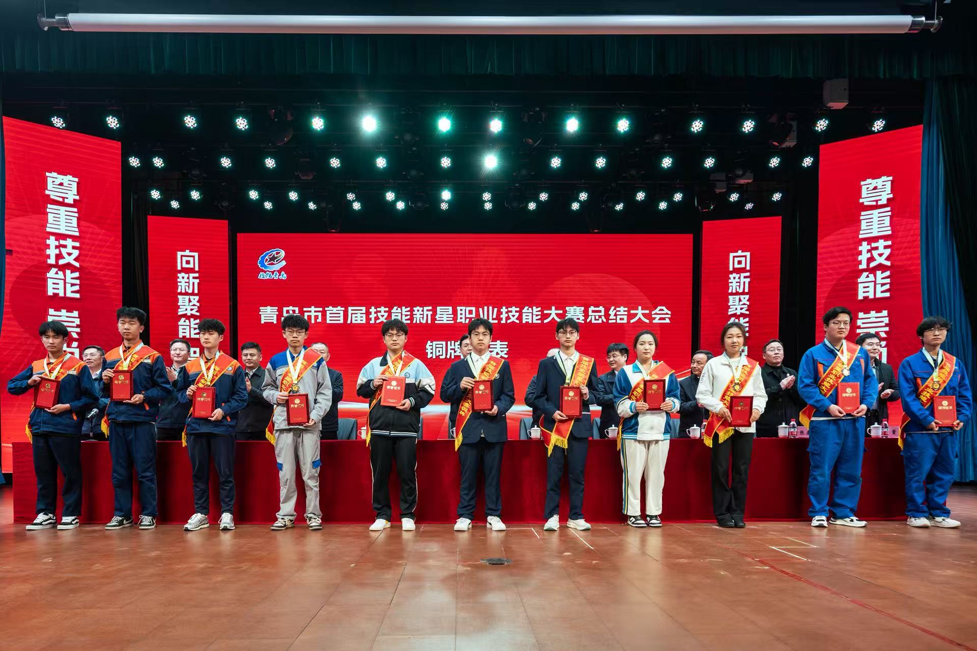 活动分两阶段举行,第一阶段为青岛市首届技能新星职业技能大赛总结大会,与会领导为青岛市首届技能新星大赛获奖选手、优秀指导教师及“青岛市技能新星”获得者颁发了奖牌和荣誉证书,并邀请获奖人员代表作交流发言。