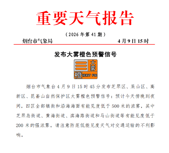 从烟台市气象台获悉,4月9日15时45分,市气象台发布芝罘区、莱山区、高新区、昆嵛山自然保护区大雾橙色预警信号:预计9日傍晚到夜间,四区全部镇街和沿海海面有能见度低于500米的浓雾,其中芝罘岛街道、黄海街道、滨海路街道和马山街道等有能见度低于200米的强浓雾。请注意防范低能见度天气对交通运输的不利影响。大众新闻·齐鲁壹点周宣刚
