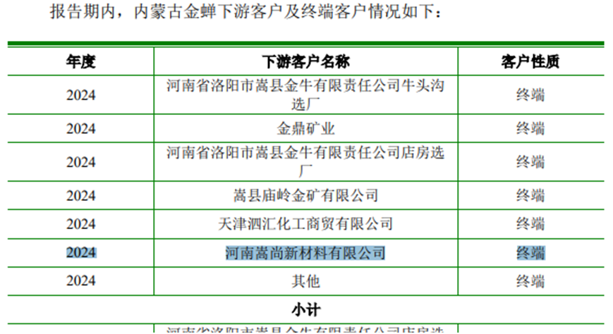 森合高科在对北交所首轮问询回复中称,河南嵩尚新材料有限公司(以下简称“嵩尚新材”)为金蝉选冶2023—2024年主要下游客户之一,客户性质为“终端”。