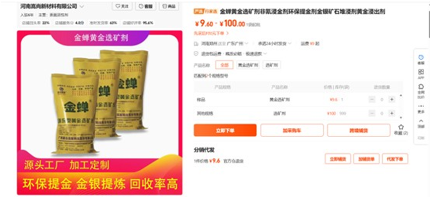 此外,据认证主体为嵩尚新材的“1688店铺”,截至查询日2026年4月7日,其在售有“金蝉黄金选矿剂非氰浸金剂环保提金剂金银矿石堆浸剂黄金浸出剂”产品,库存为999袋。并且产品信息显示,金蝉黄金选矿剂有“源头工厂、加工定制、环保提金、回收率高”等特征。