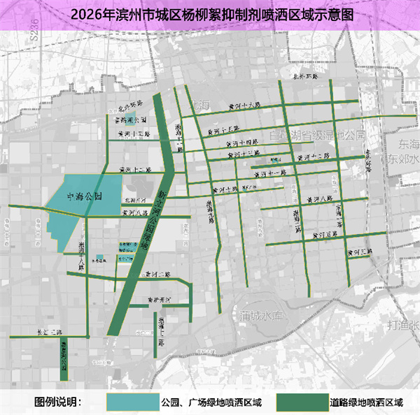 市城区范围内杨柳树集中种植区域,具体范围详见《2026年滨州市城区杨柳絮抑制剂喷洒区域示意图》。