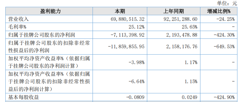 4月7日,山东京普太阳能科技股份有限公司(证券代码:872461.NQ,证券简称:山东京普)正式披露2025年年度报告。年报显示,公司报告期内实现营业收入6988.05万元,同比减少24.25%;归属于挂牌公司股东的净利润为-711.34万元,同比下滑424.30%;基本每股收益为-0.0809元/股,同比下滑424.90%。