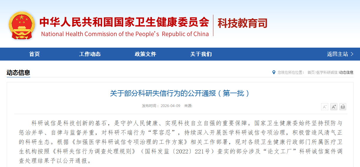 国家卫健委通报10起科研失信行为