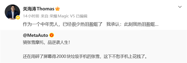“骑张雪摩托,品逆袭人生!还在用碎了屏幕得2000块手机的张雪,这下不愁手机上花钱了。”一位网友说道。