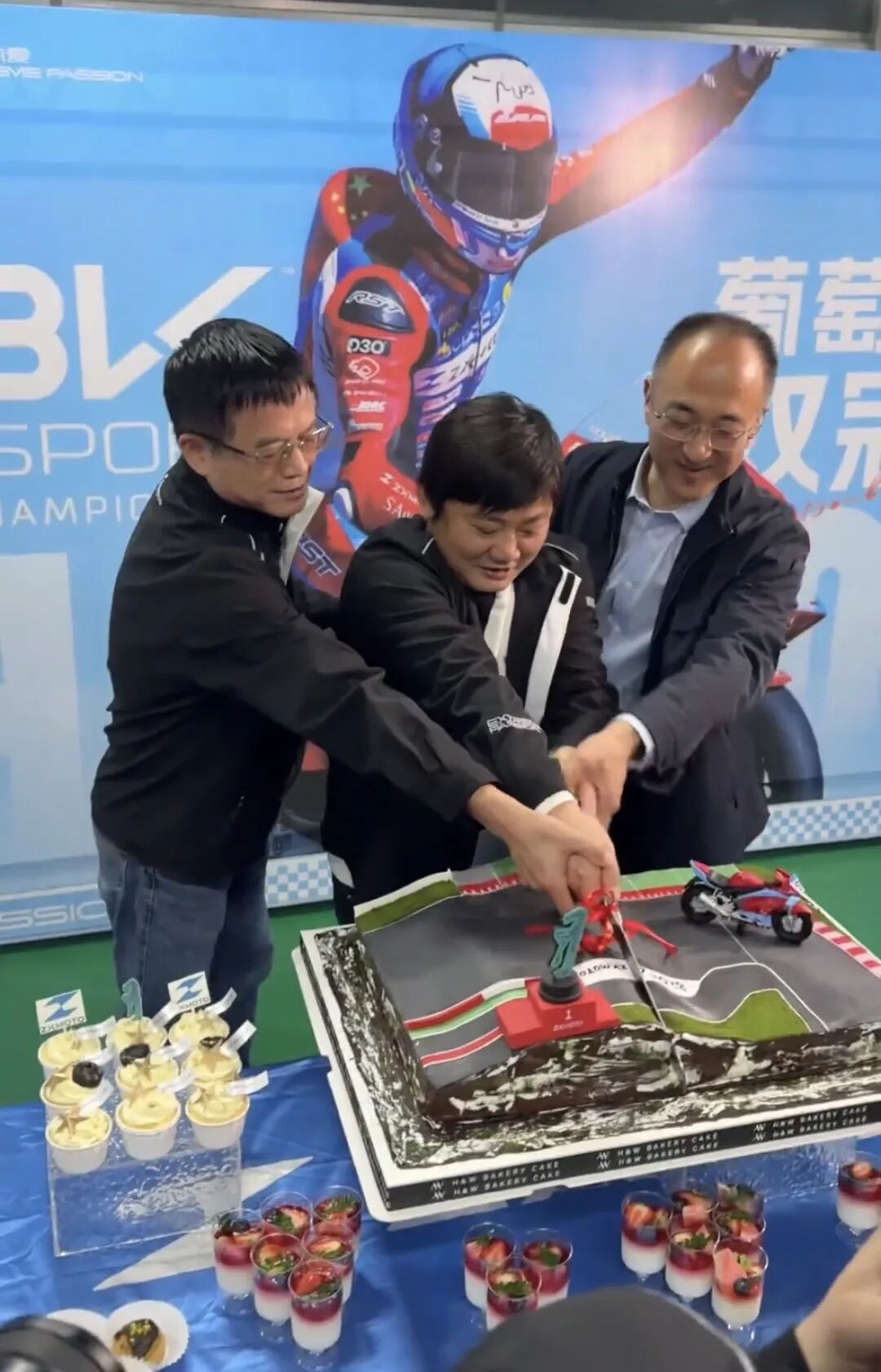 多名张雪机车的员工也分享了现场庆祝视频。视频中,领先第二名以近4秒优势冲过终点的“世界名画”场面被做成蛋糕,张雪与程俊华共同持刀切下蛋糕。