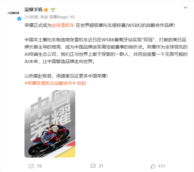 张雪也在直播中亲口确认了这份合作,对着镜头郑重致谢:“特别感谢荣耀手机对张雪机车赛事的鼎力支持,非常感谢。”