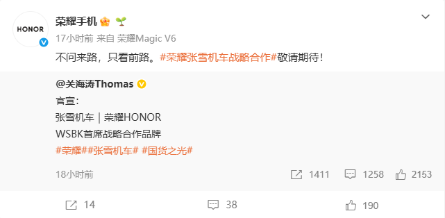 (齐鲁晚报·齐鲁壹点客户端编辑 刁俊艳综合关海涛Thomas新浪微博、荣耀手机新浪微博、张雪机车抖音号、公开信息等)