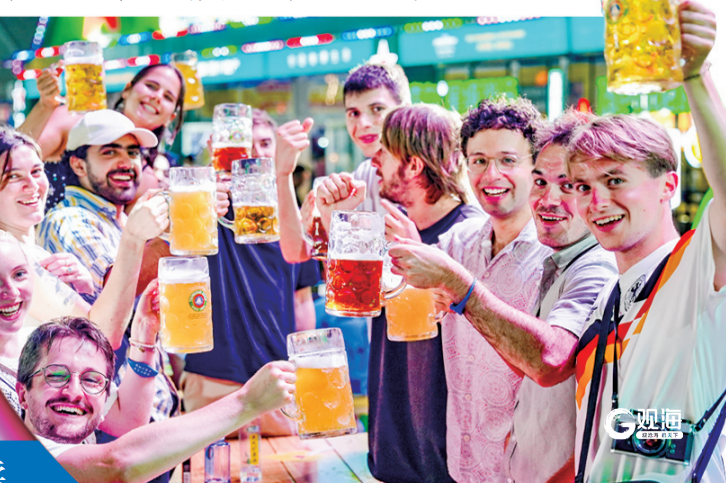 外国游客在第35届青岛国际啤酒节上畅饮。