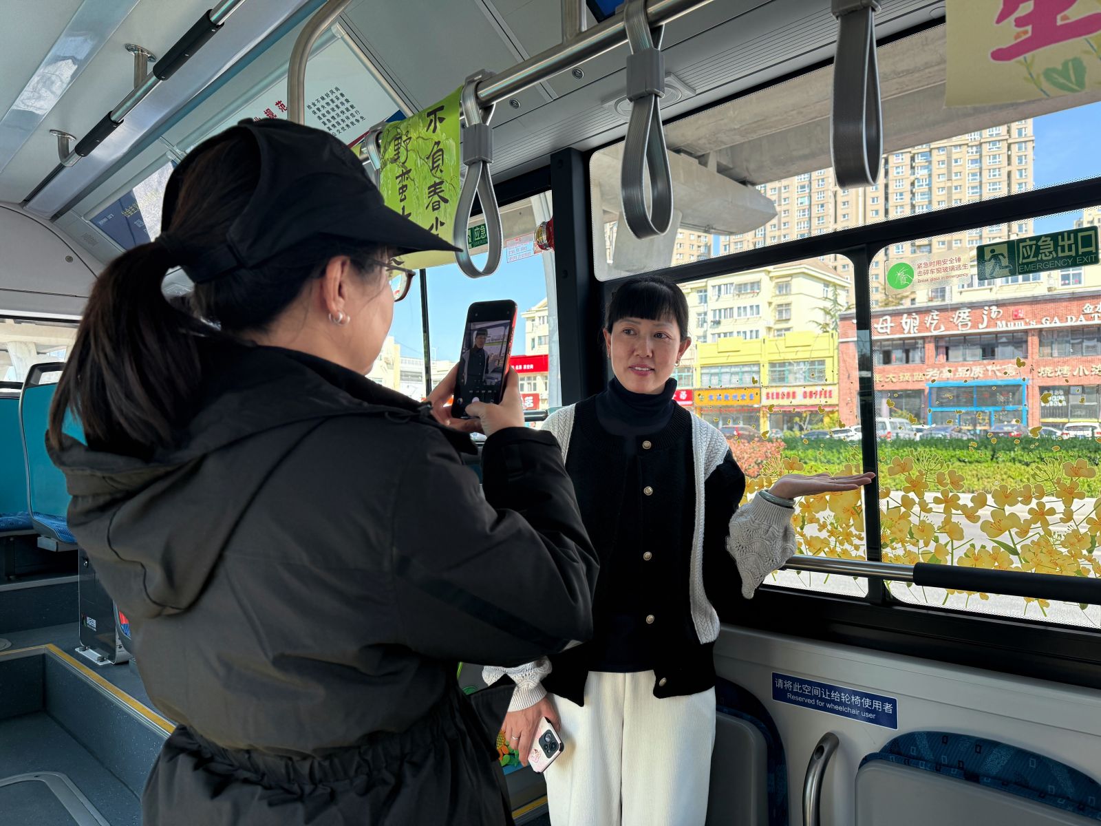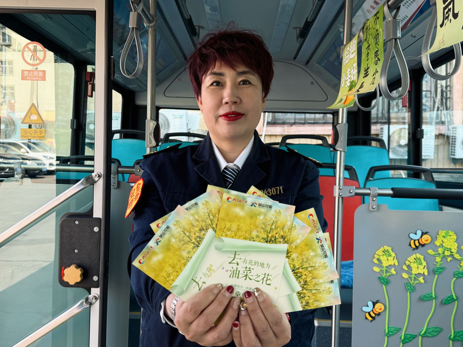 走进115路DD2561号车,浓郁的春日气息扑面而来。车厢扶手杆上,悬挂着“春风有信”“采春光迎春风”“万物生长”等春日氛围装饰,温馨而富有诗意;两侧车窗玻璃贴满了金灿灿的油菜花图案贴纸,放眼望去,仿佛置身花海之中。更令人眼前一亮的是,115路驾驶员孙美玲手工制作了“蜜蜂采蜜”的图案,贴在了靠近车门的位置,为车厢增添了生机与童趣。“春天到了,希望用这种温馨美好的方式,让乘客一上车就能感受到春天的气息,在出行过程中一路赏春。”孙美玲说。