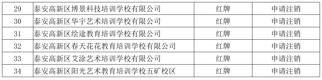 近日,泰安高新区社会事务部教体科发布泰安高新区2026年校外培训机构第一季度预收费监管三色管理名单,被评为“红牌”的校外培训机构有19家,应立即停业整顿并在1个月内完成问题整改。详情如下: