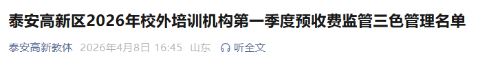 现将泰安高新区2026年校外培训机构第一季度三色管理名单公布如下: