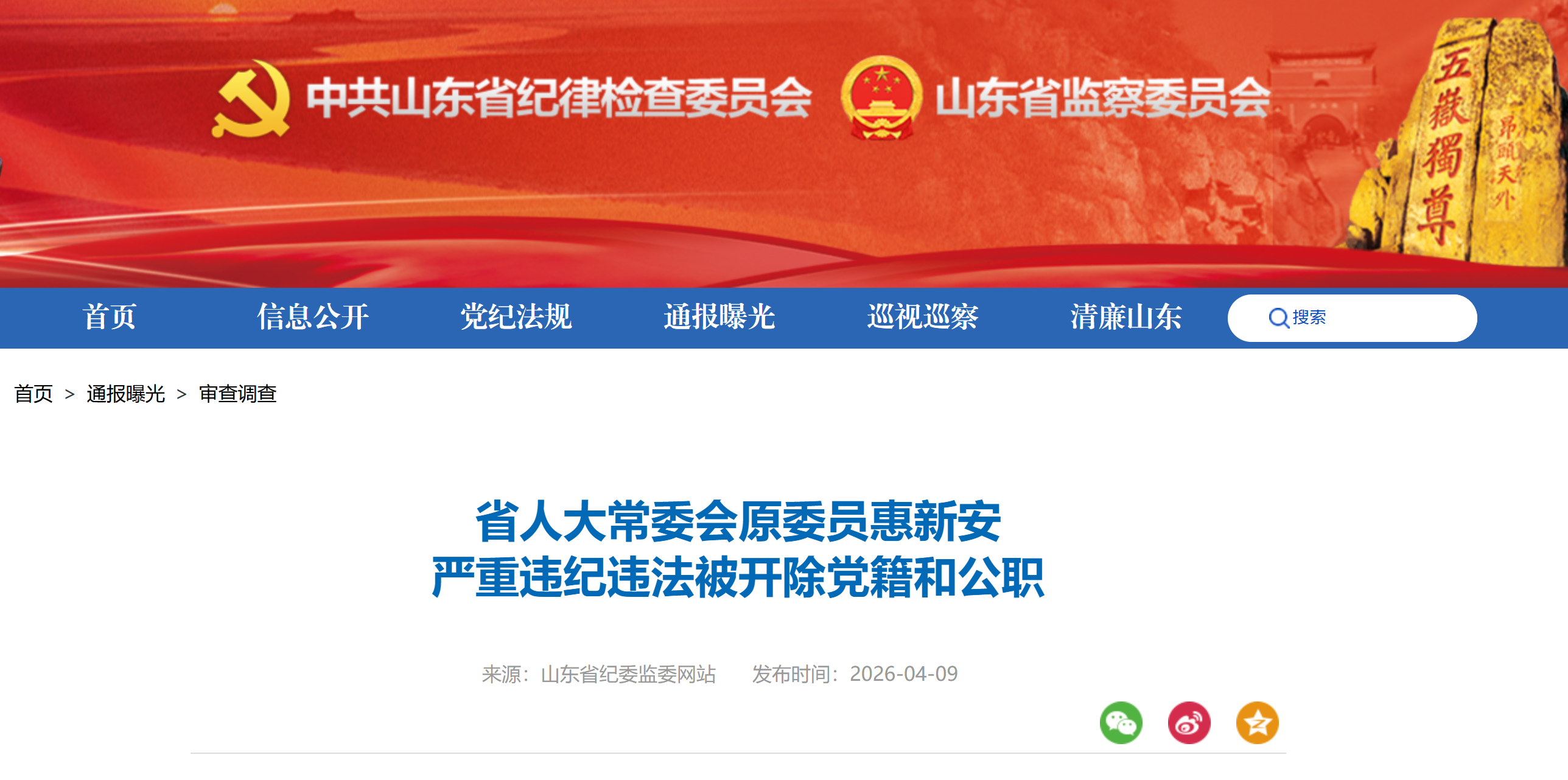 山东省纪委监委网站4月9日消息,省人大常委会原委员惠新安严重违纪违法被开除党籍和公职。