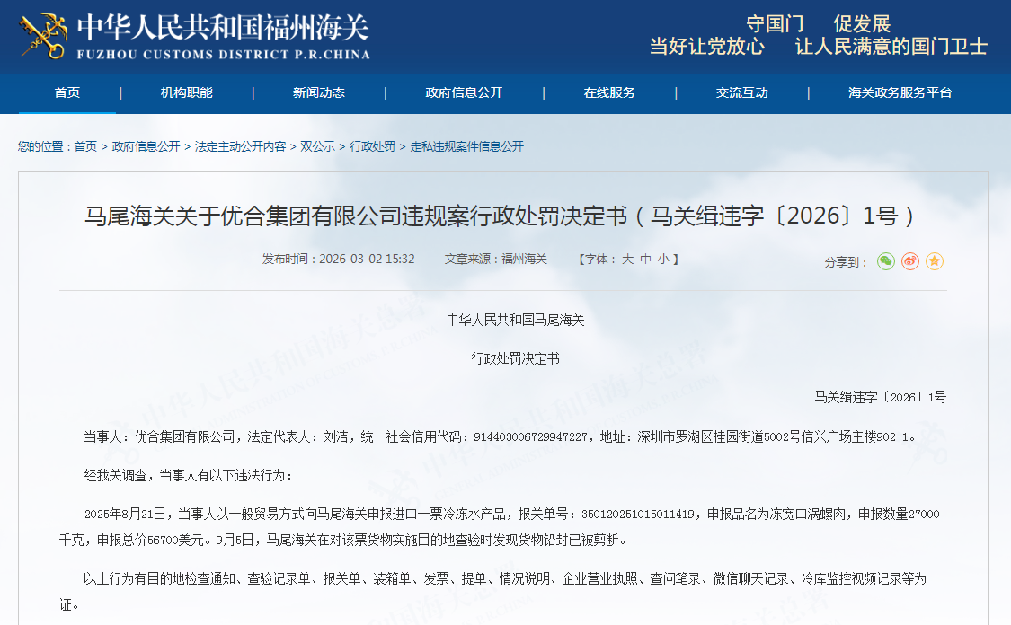 齐鲁晚报·齐鲁壹点记者了解到,据中华人民共和国福州海关3月2日公示的马尾海关关于优合集团有限公司违规案行政处罚决定书(马关缉违字〔2026〕1号),优合集团曾被罚款4000元。